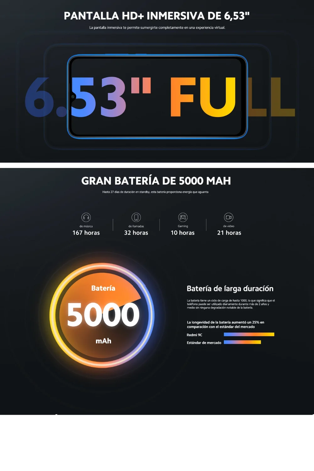 Este Redmi 9C é um produto com poucos concorrentes em termos de multimídia graças à câmera de 13 megapixels que permite ao Redmi 9C tirarFotos fantásticas com uma resolução de 4128x3096 pixels e fazer vídeos em alta definição (Full HD) com uma resolução de 1920x1080 pixels. Muito fino, 9 milímetros, o que torno o Redmi 9C realmente interessante.