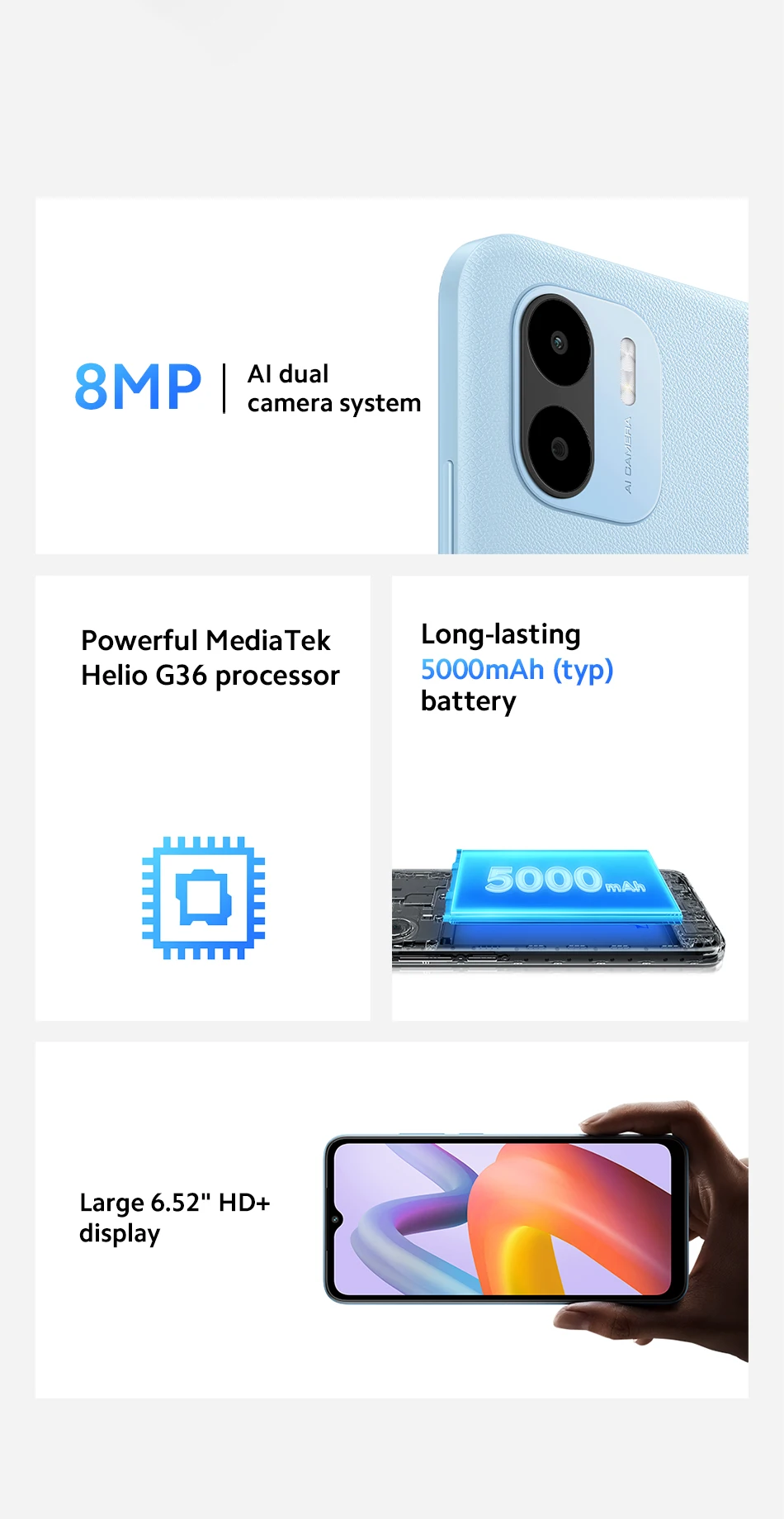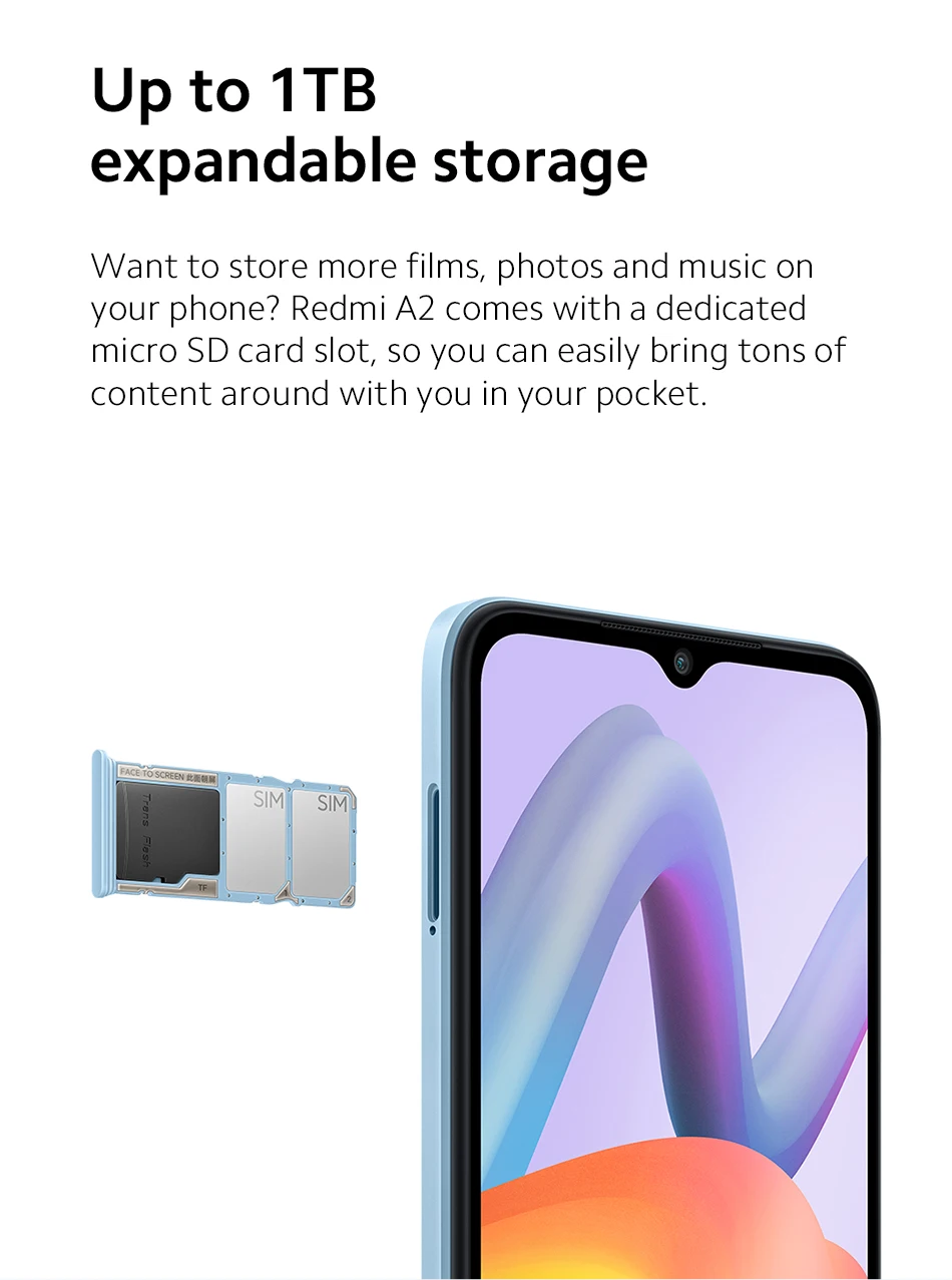 O Redmi A2 possui um impressionante processador octa-core, oferecendo todo o poder que você precisa para navegação perfeita e consumo multimídia.