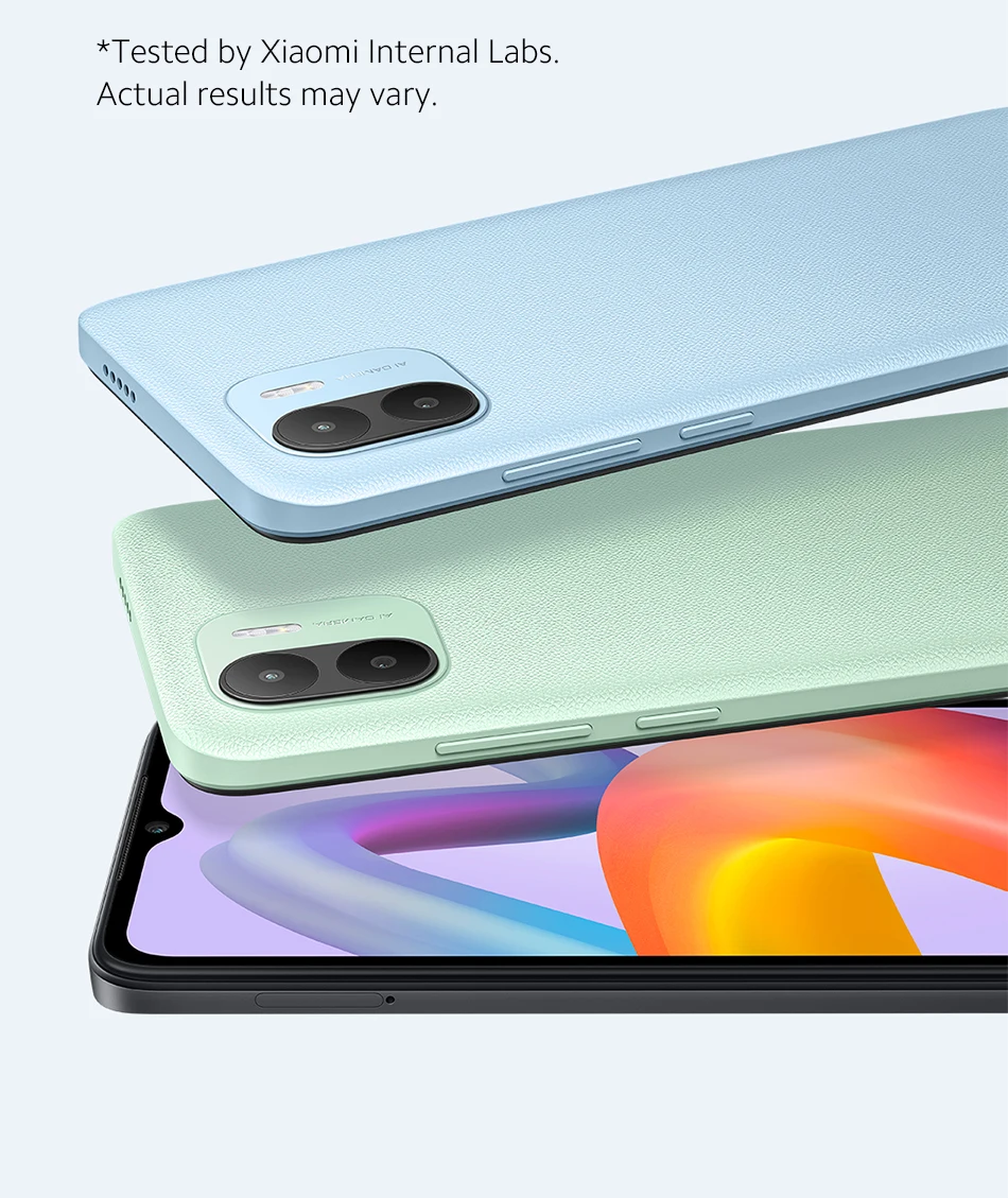 O Redmi A2 vem com um design moderno de estrutura plana disponível em tons suaves de preto, verde e azul. O painel traseiro texturizado tem uma aparência premium que resiste a manchas de impressão digital e é confortável de segurar por um longo período de tempo.